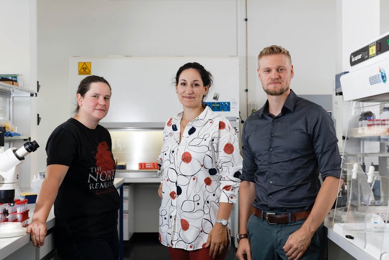 Deana Mohr (Bildmitte) ist CEO und Mitbegründerin von MUVON Therapeutics, einem Spin-off der UZH. Deana Mohr wurde im Rahmen eines UZH Entrepreneur Fellowship bei ihrer Firmengründung unterstützt. Ausserdem im Bild: Die beiden Co-Gründer Jenny Prange und Steve Kappenthuler.