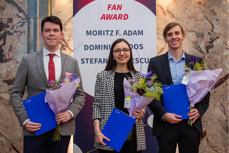 The award recipients presented their work in brief talks. Moritz F. Adam studies concepts of time and apocalypticism in Hellenistic Judaism. Dominik Gross investigates a tiny brain region (lateral habenula) and its influence on risk-related decisions. Stefania Ionescu analyzes visibility allocation systems and their influence on society.
