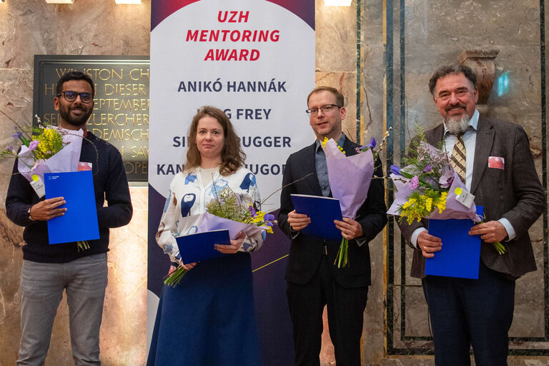 Pascal Gygax’s remarks flowed seamlessly into the presentation of the UZH Mentoring Award, which is presented by the Graduate Campus to outstanding supervisors of doctoral students. Doctoral students are also the ones who nominate potential award recipients, who are then selected by a jury of early-career researchers from all of UZH’s seven faculties. From a longlist of 32 nominations, the following four individuals were selected for the UZH Mentoring Awards 2025: